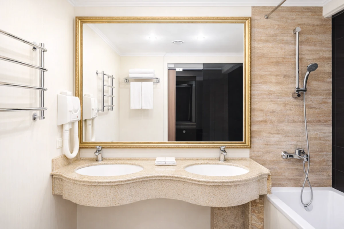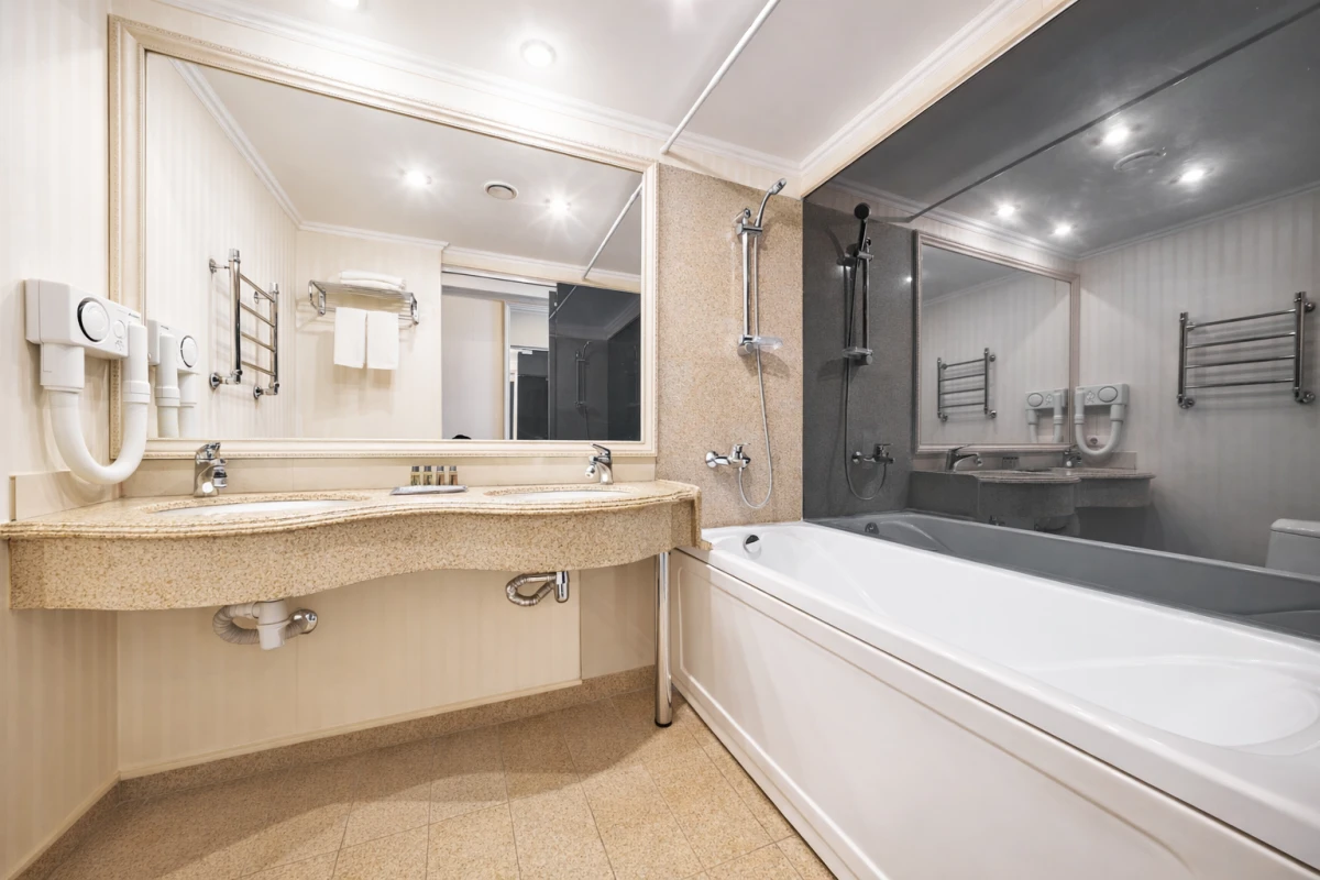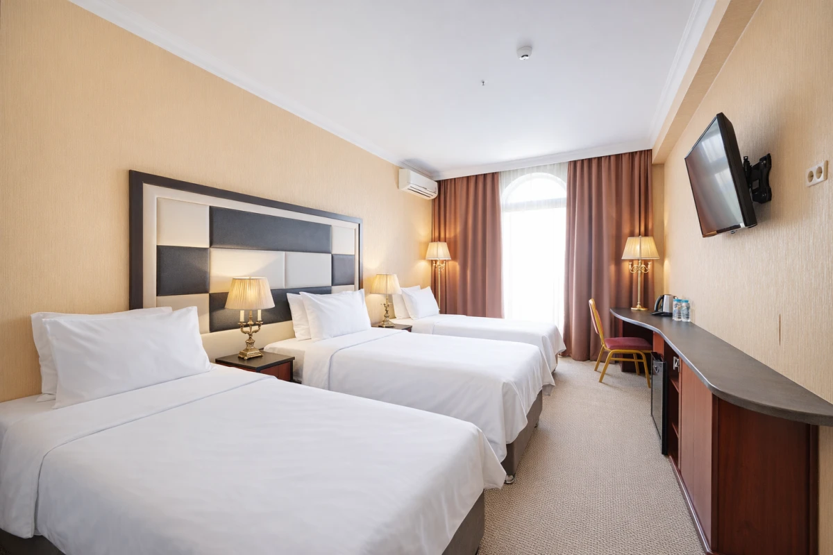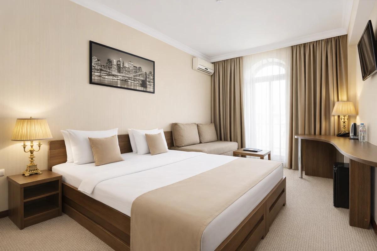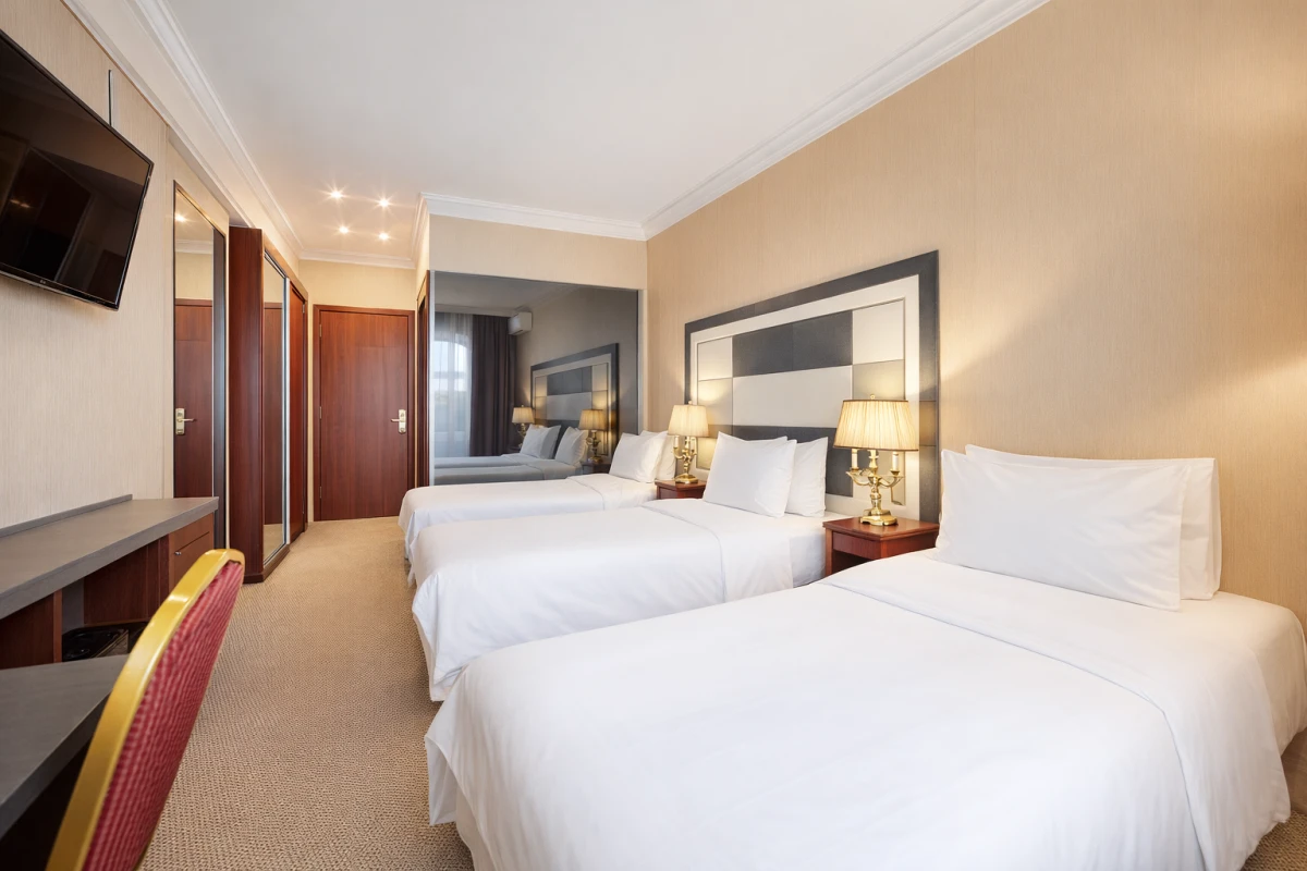 تم تزيين الغرف الفسيحة بمساحة إجمالية تصل إلى 29 مترا مربعا بألوان ذهبية وبيج دافئة. هذه الغرفة مثالية للضيوف المسافرين مع الأطفال ، والذين يمكن استيعاب سرير إضافي لهم. تم تجهيز الحمام الأوروبي القياسي بكابينة دش أو حوض استحمام.