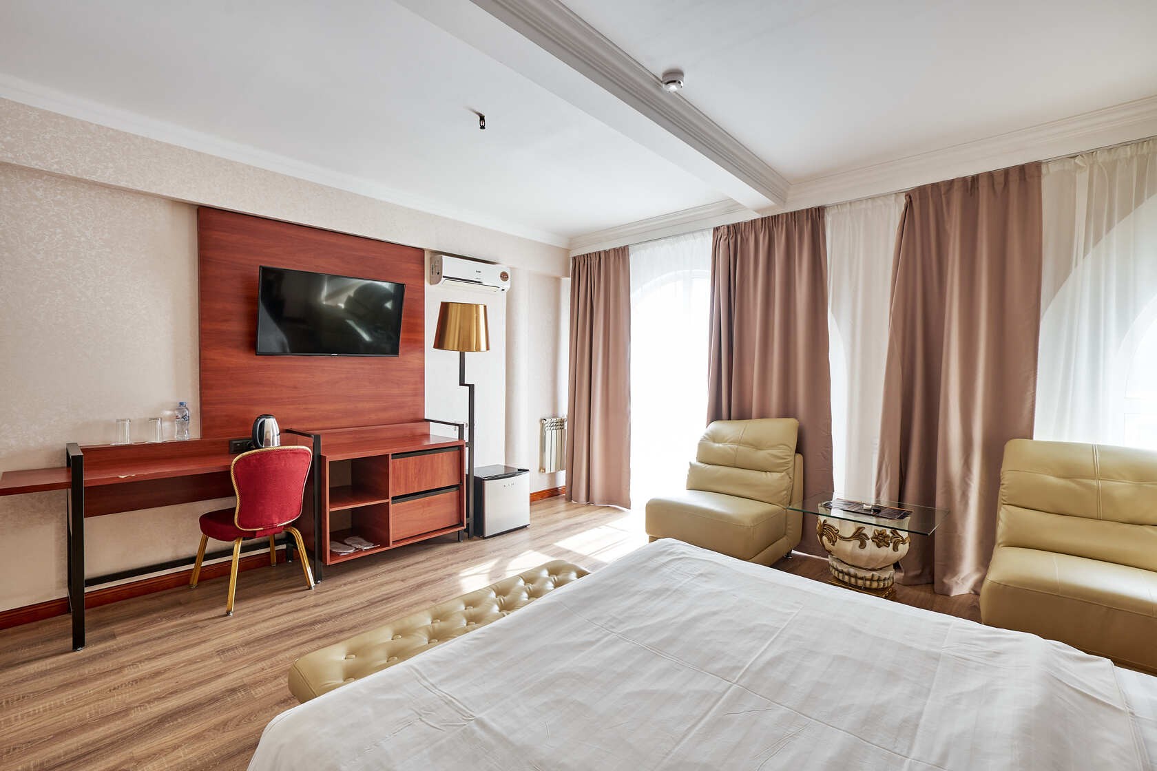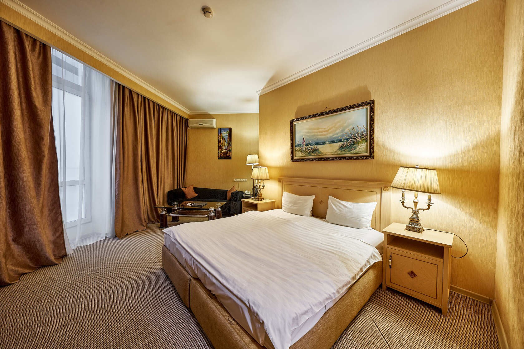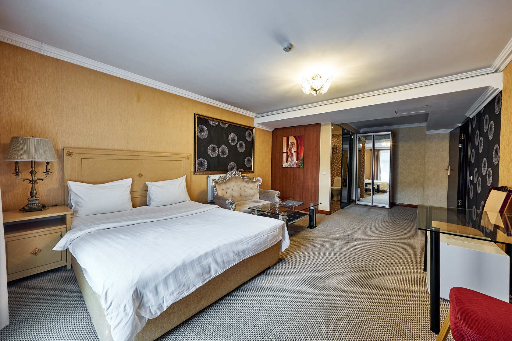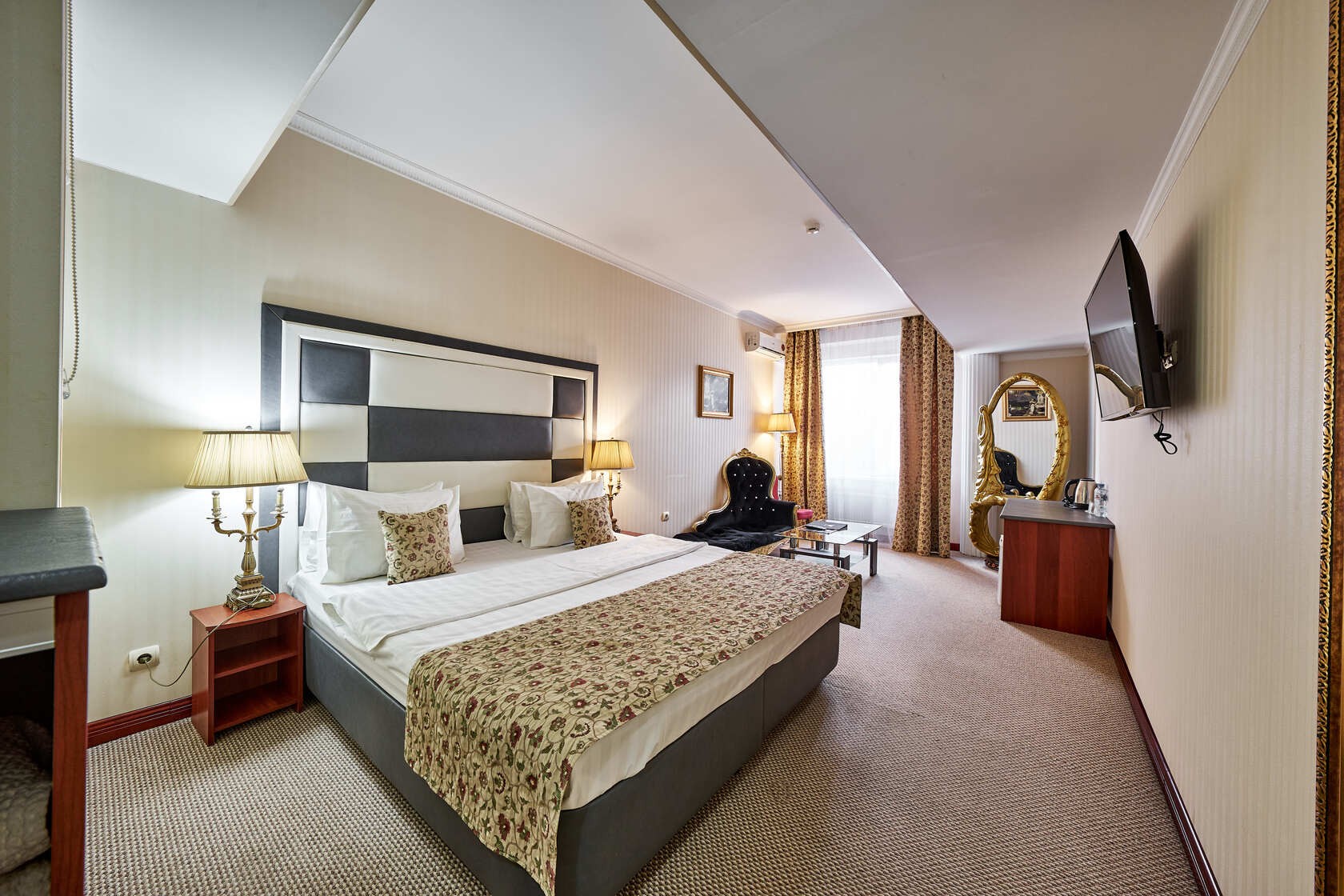 Habitación amplia de estilo clásico con zonas de ocio y de negocios. Las habitaciones tienen una superficie total de hasta 30 m2, están diseñadas en colores cálidos. El baño está equipado con Bañera o Jacuzzi y Secador de pelo.